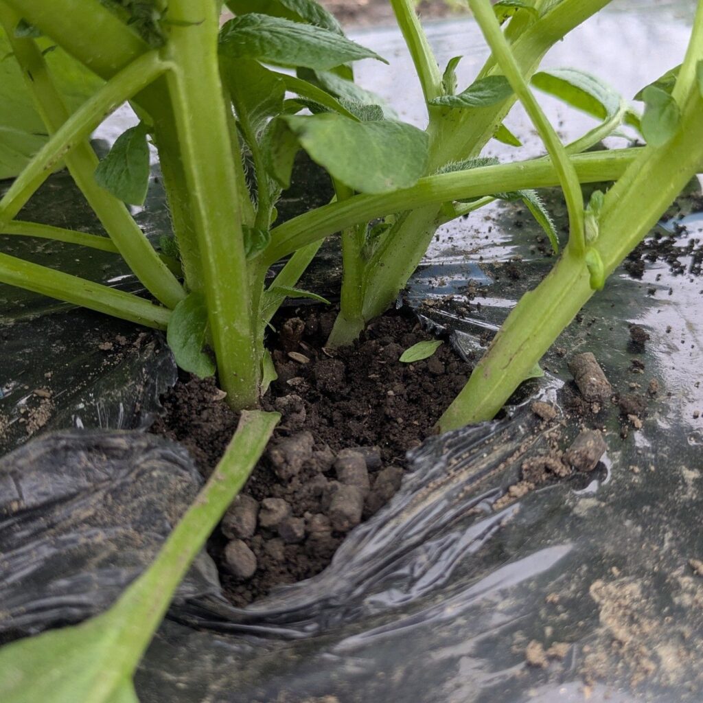 YouTubeでひとみさんと一緒にジャガイモ定植した時に、株間に肥料入れ忘れるというボケをかましたので、芽かきタイミングで追肥をしました。追肥に使っているのは有機ぼかし肥料です。